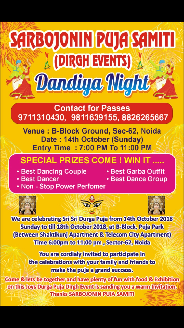 We all together shall make it a most optimum celebration with exchange of ideas. Language will not be any barrier. Believe it Sector 62 Puja is the biggest Puja in Noida and we shall keep it best. We must elevate out levels to steer past the best every year. Look for every opportunity to get funds, either through subscriptions or Advertisements or simple donations. This is one time when we remember our innocent childhood days asking parents to buy silly things like balloons, wooden toys, small flutes and we were so happy making noise. So, we all should become small child during the puja days and enjoy the festival to its brim. Ma Durga comes with her children hence our children must go there to greet her children..